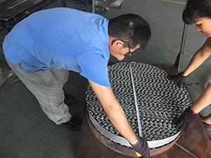 SM250型直徑為810的孔板波紋填料為半自動手工加工產(chǎn)品,質量檢測人員核實孔板設計數(shù)據(jù),檢測孔板波紋填料的實際直徑。對技術人員提出保證峰高估算距離合理性的建議,對加工工人提出保證每片孔板長度的精確度達到±0.5mm。以保證產(chǎn)品符合合同要求,保證滿足客戶所需,保證產(chǎn)品質量100%合格。